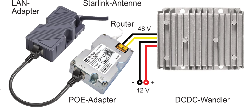 A DCDC dönüştürücü Gemide bulunan 12 V ile çalışan bu güç, gerekli 48 V DC'ye dönüştürülür ve böylece ayrı POE adaptörü. Bu, 48 V DC'yi (şu anda mevcut değil) LAN adaptörü (resimde test edilmemiş alternatif bir ürün gösterilmektedir). LAN adaptörü, standart olmayan Starlink anten bağlantısını CAT7 ağ standardına dönüştürür ve anteni 48 V DC besleme voltajı ile besler, böylece anten ile herhangi bir yönlendirici arasında veri trafiğini de sağlar.